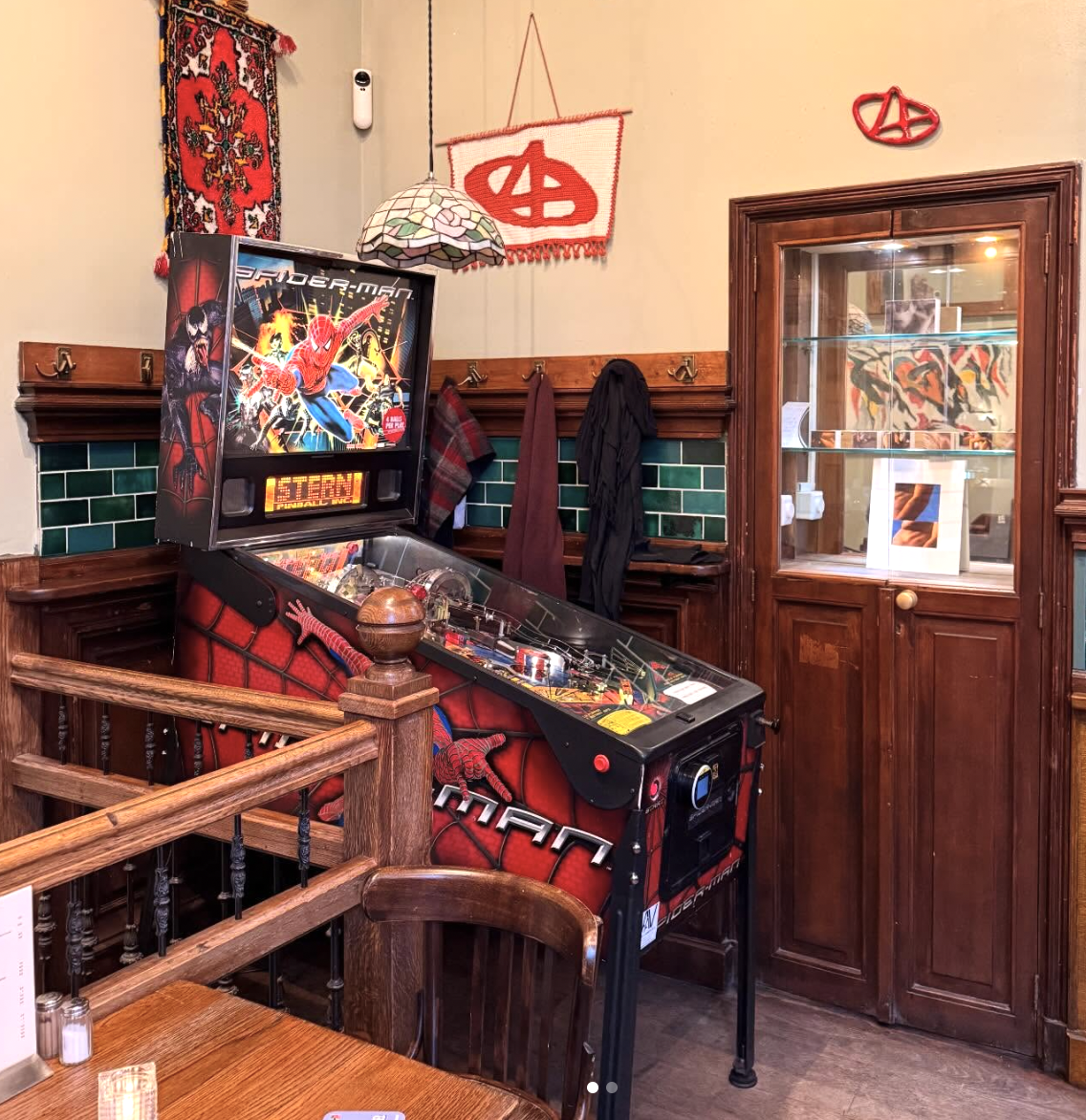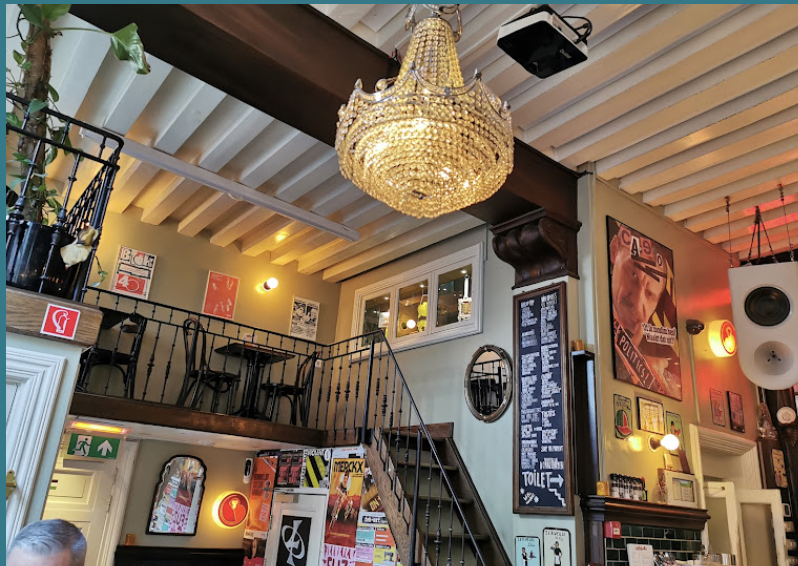 Onze ruimte is eclectisch ingericht — kristallen kroonluchters, vintage posters, kunst aan de muren en een warme houten bar. Zoals een echte Amsterdamse kroeg hoort te zijn.